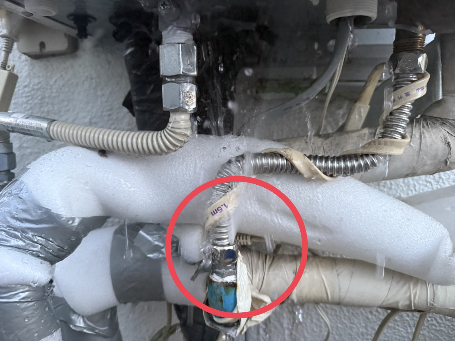 現地で確認したところ、給湯器の給水側フレキ管(柔軟パイプ)のつば出し部分が凍結により変形し、亀裂から水が噴き出している状態。