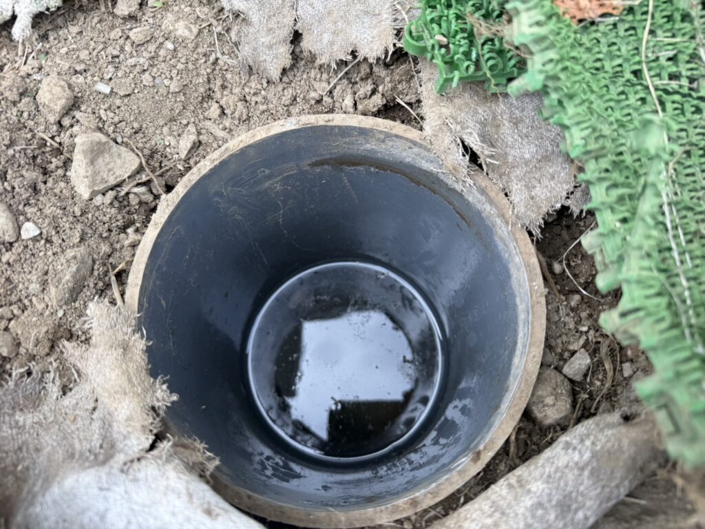 屋外排水管の内部で汚れが固まり、排水がスムーズに流れない状態になっていました。