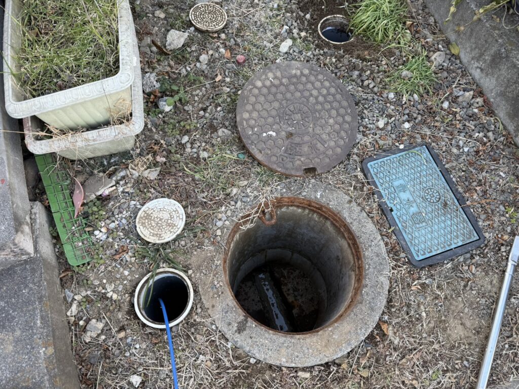 トイレ本体や便器内に異物の詰まりがないことを確認したうえで、屋外の排水マスを点検したところ、