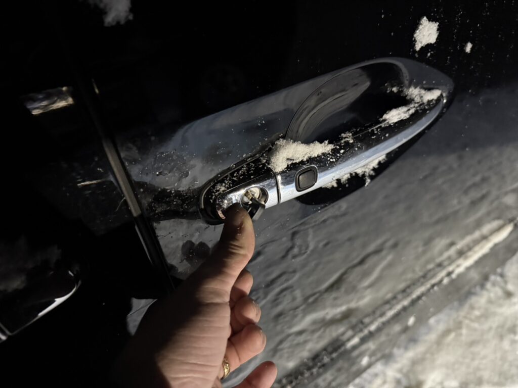 雪が降る中でも丁寧な作業で、無事に トヨタ・アルファードに合う新しいスマートキーをその場で完成!