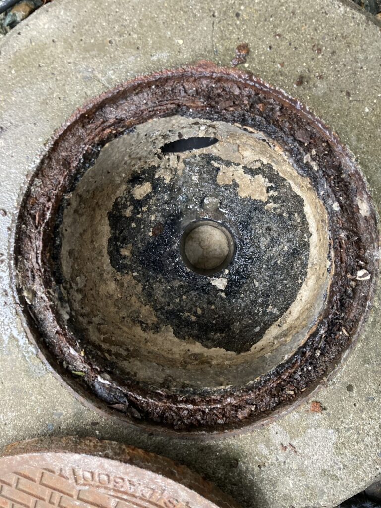 現地を確認したところ、排水管の内部に汚れや油分が長年蓄積しており、流れがほぼ止まっている状態。