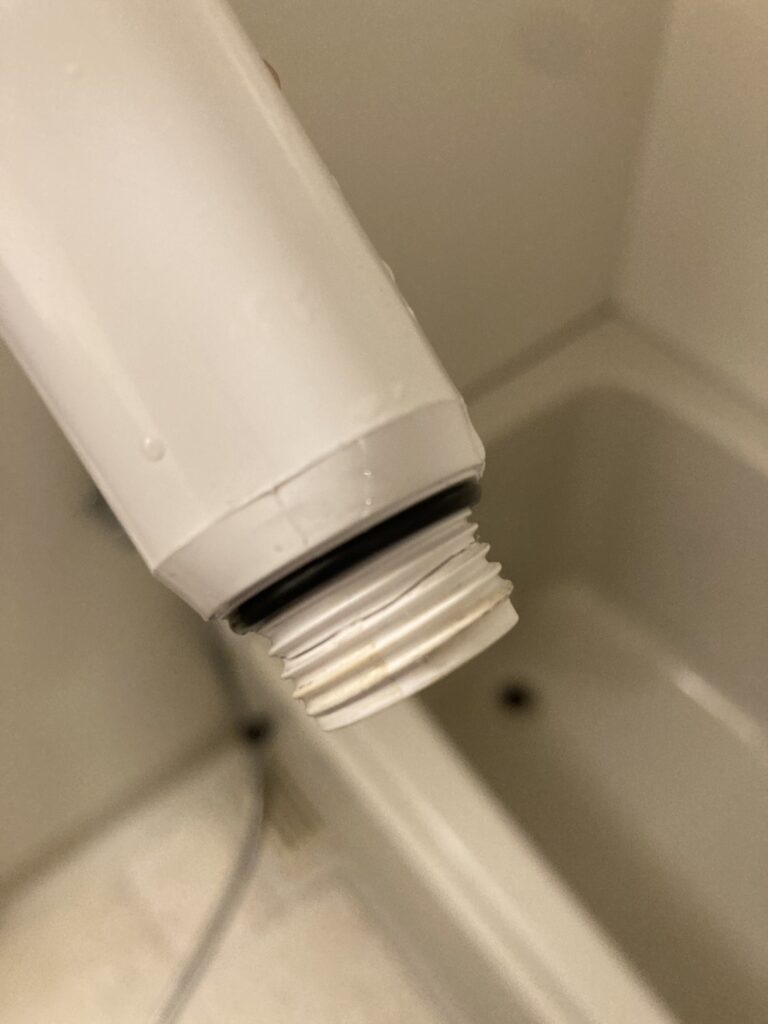 拝見すると、ホースとヘッドの接続部分が割れて隙間から水が噴き出している状態。毎日の入浴で使う場所だからこそ、早めの対応が大切ですね。