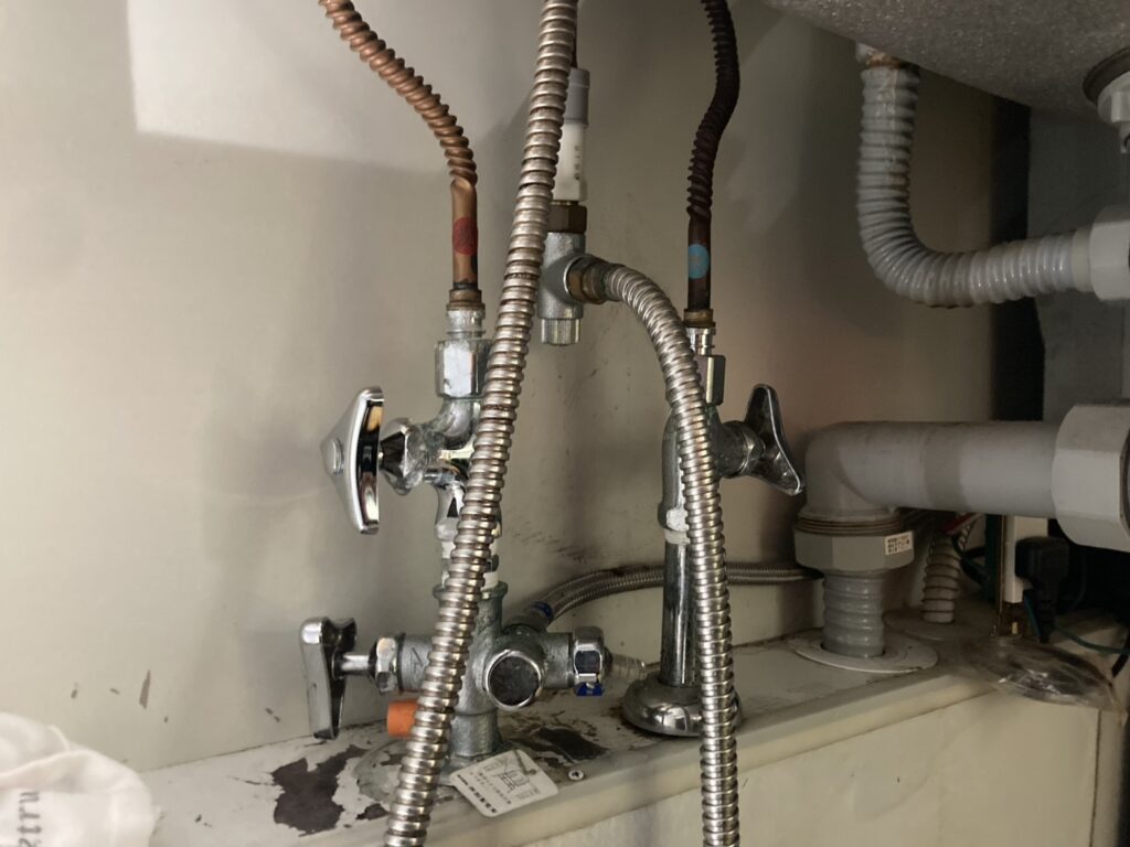 その後、新しい水栓を設置して給水・給湯の接続をし、水漏れチェック。