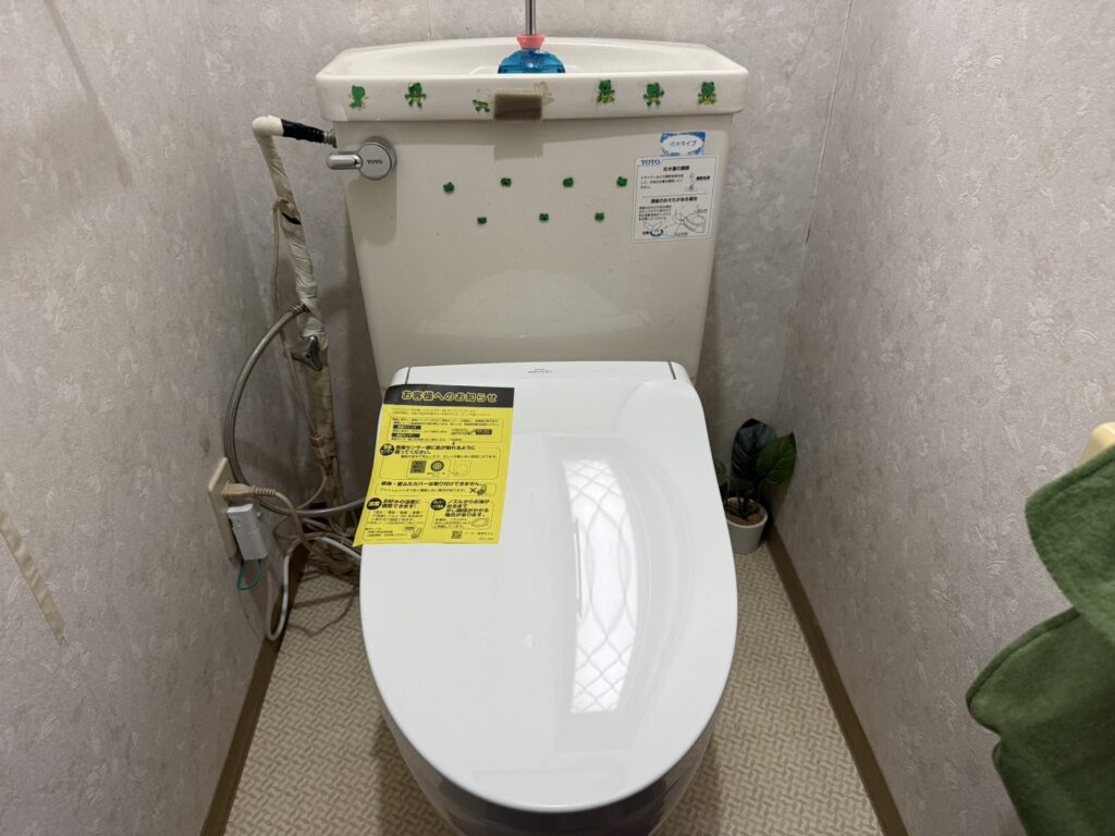今回は安曇野市内のお客様より、「購入したウォッシュレット(温水洗浄便座)を取り付けてほしい」というご依頼をいただきました。既存の便座は古くなっていたため、取り外し・処分もあわせて対応しました。